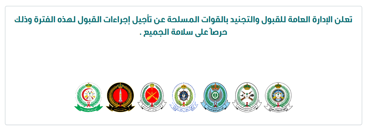أعلنت وزارة الدفاع مُمثلة في الإدارة العامة للقبول والتجنيد بالقوات المسلحة عن تأجيل إجراءات القبول لهذه الفترة وذلك حرصاً على سلامة الجميع.