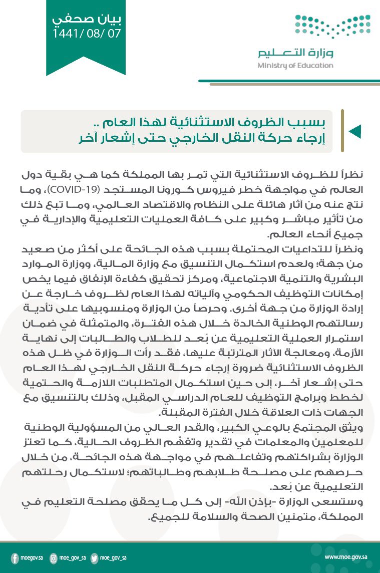 جاء ذلك في بيان صحفي صدر اليوم عن وزارة التعليم وذلك نظراً للظروف الاستثنائية التي تمر بها المملكة كما هي بقية دول العالم في مواجهة خطر فيروس كورونا المستجد (Covid-19)، وما نتج عنه من آثار هائلة على النظام والاقتصاد العالمي، وما تبع ذلك من تأثير مباشر وكبير على كافة العمليات التعليمية والإدارية في جميع أنحاء العالم.