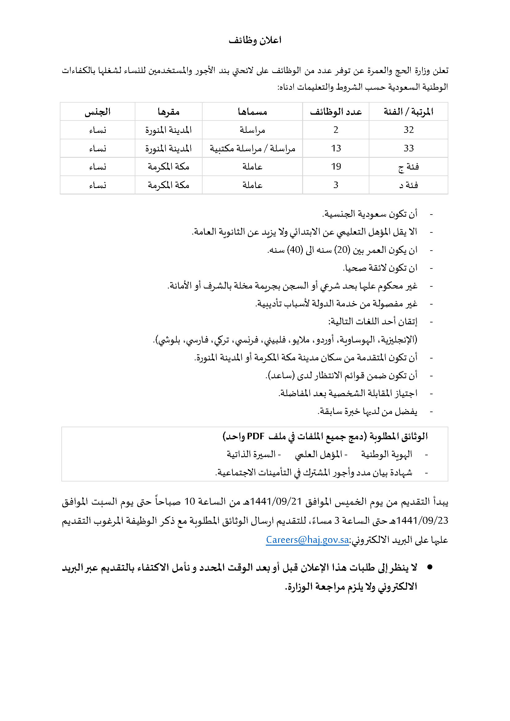 وظائف على لائحتي بند الأجور والمستخدمين في وزارة الحج والعمرة