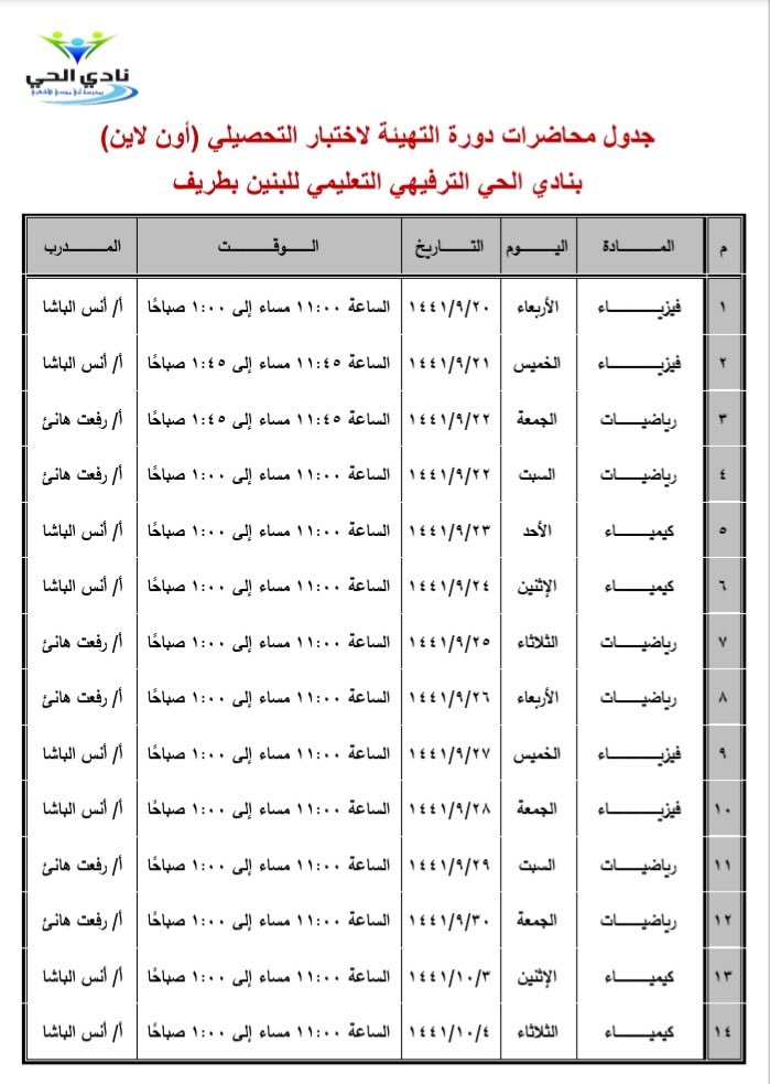 – أوضح قائد نادي الحي محمد بن سالم الرويلي أن الدورة مجانية وتستهدف طلاب وطالبات الثالث الثانوي والمواد المستهدفة الرياضيات والكمياء والفيزياء بواقع 4 أيام للكيمياء والفيزياء وستة أيام للرياضيات ولمدة ساعتين باليوم، بهدف إكساب الطلاب والطالبات المهارات اللازمة وتأهيلهم لآداء الاختبار بكفاءة عالية والحصول على أعلى الدرجات.