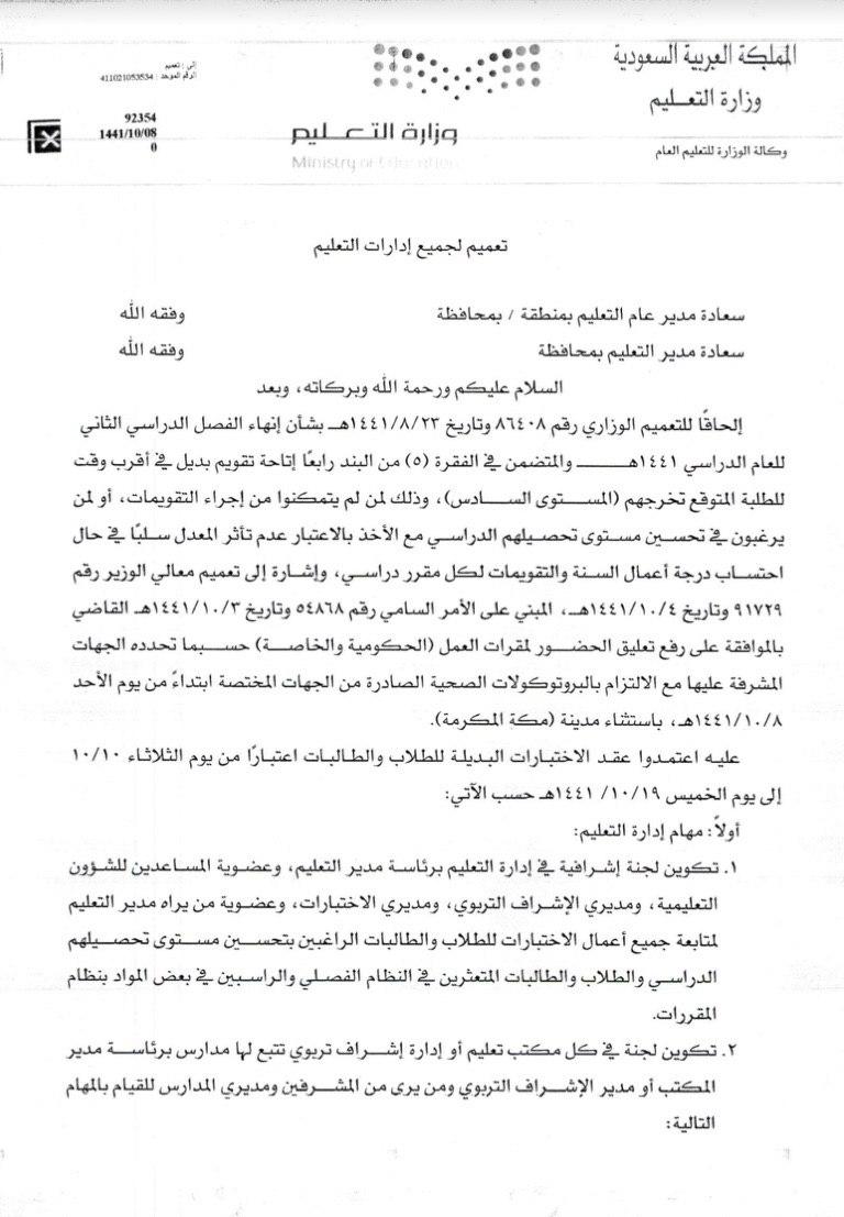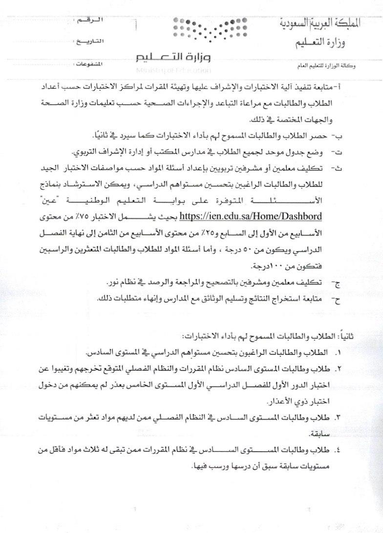 وزارة التعليم تعتمد إجراءات عقد الاختبارات البديلة للطلاب والطالبات وآلية تكليف المعلمين بوضع الأسئلة