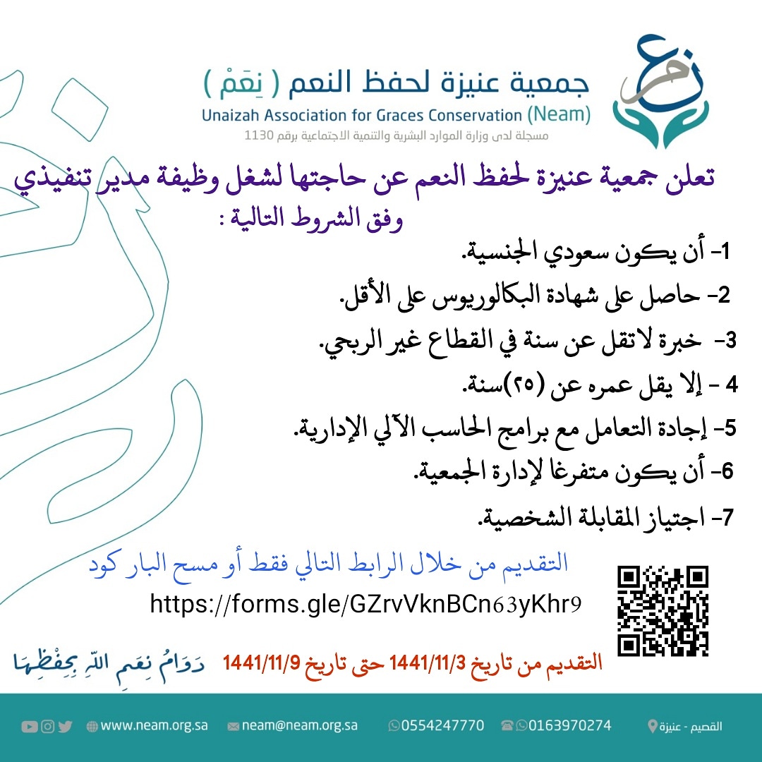 مطلوب مدير تنفيذي في جمعية عنيزة لحفظ النعم