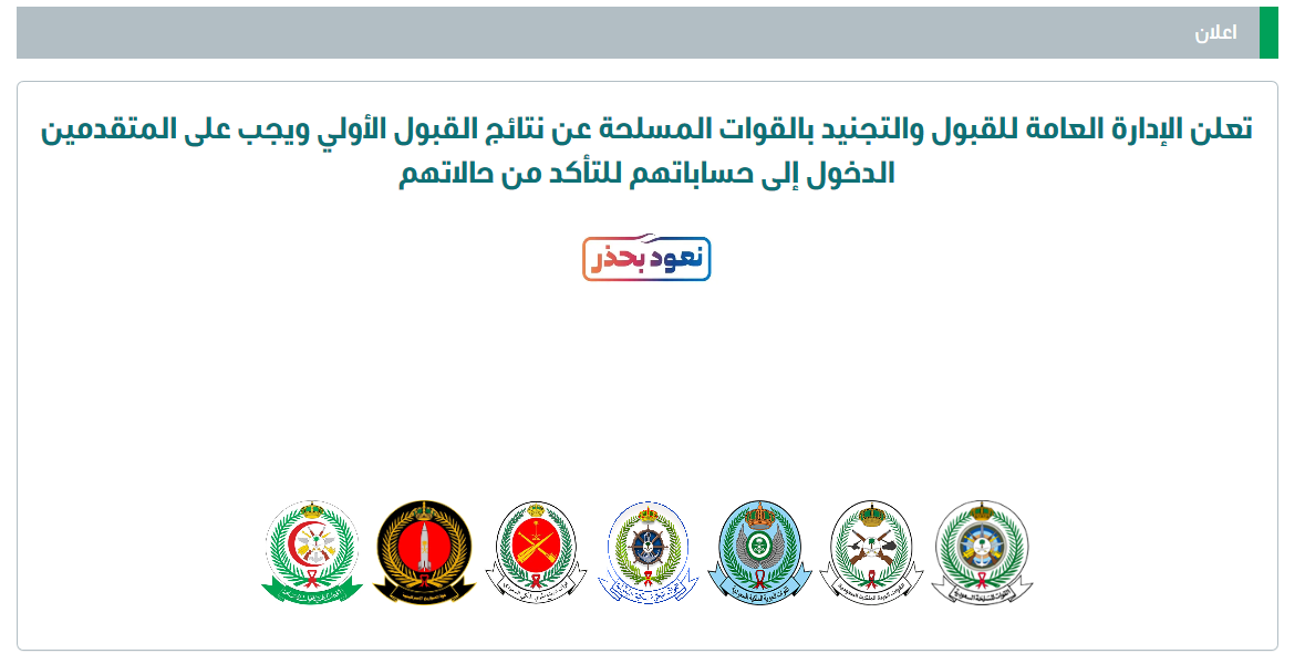 أعلنت وزارة الدفاع مُمثلة في الإدارة العامة للقبول والتجنيد بالقوات المسلحة عبر موقعها الإلكتروني عن (نتائج القبول الأولي) ويجب على المتقدمين الدخول إلى حساباتهم للتأكد من حالاتهم، وذلك وفقاً لطريقة الاستعلام الموضحة أدناه.