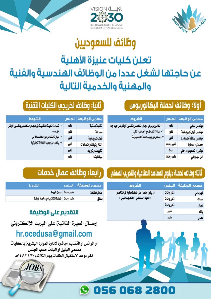 وظائف هندسية وفنية ومهنية وخدمية للجنسين في كليات عنيزة