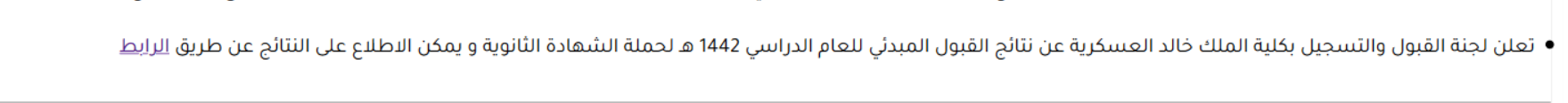 أعلنت وزارة الحرس الوطني مُمثلة في لجنة القبول والتسجيل بكلية الملك خالد العسكرية عن نتائج القبول المبدئي للعام الدراسي 1442 هـ لحملة الشهادة الثانوية، والتي سبق الإعلان عنها من خلال موقع الكلية، وذلك وفقاً لطريقة الاستعلام الموضحة أدناه.