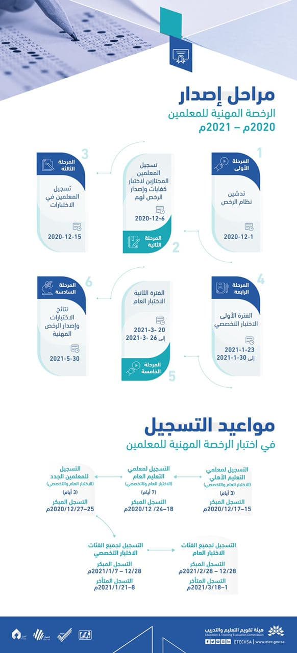 وسيبدأ التسجيل للمجتازين لاختباري الكفايات (العام، والتخصصي) وإصدار الرخصة لهم اعتبارًا من 2020/12/6م حسب المواعيد التالية اضغط هنا
