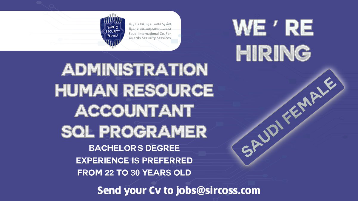 وظائف نسائية في شركة سيركو العالمية للخدمات الأمنية بمدينة الرياض، للعمل بالمسميات التالية (أخصائية موارد بشرية، ومحاسبة رواتب، ومبرمجة قواعد بيانات)، واشترطت الشركة أن تكون المتقدمة سعودية الجنسية، وذلك وفقاً للتفاصيل الموضحة أدناه.