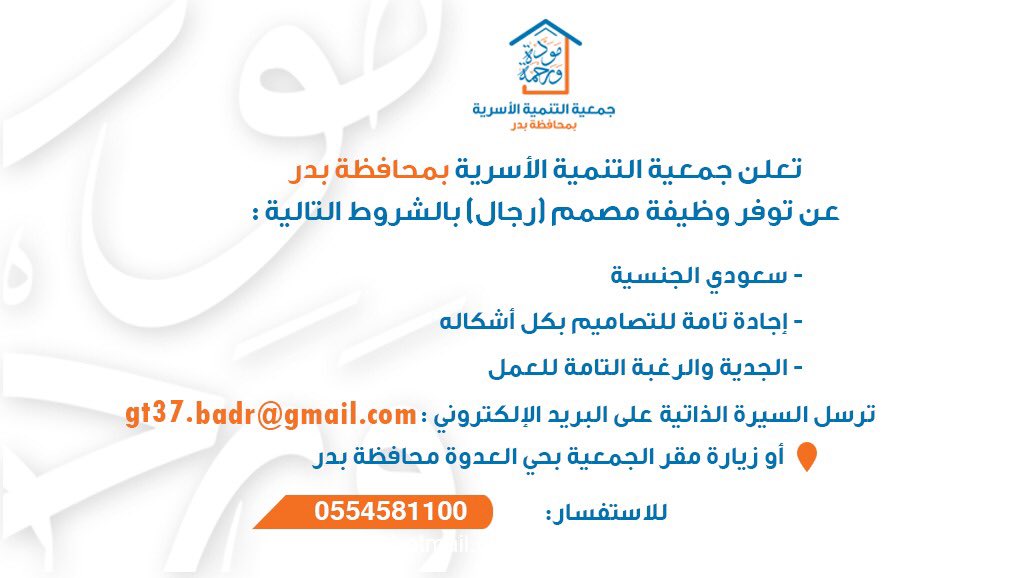 مطلوب مصمم في جمعية التنمية الأسرية، واشترطت الجمعية أن يكون المتقدم سعودي الجنسية، وذلك وفقاً للتفاصيل وطريقة التقديم الموضحة أدناه.