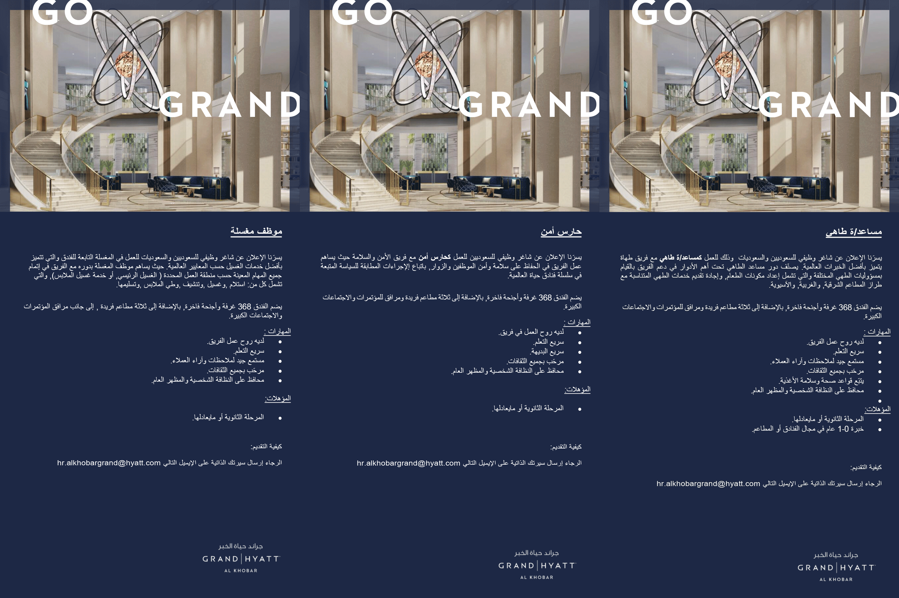 وظائف للجنسين لحملة الثانوية العامة في فندق جراند حياة الخبر، للعمل بالمسميات التالية (حارس أمن، وموظف مغسلة، ومساعد/ة طاهي)، وذلك وفقاً للتفاصيل الموضحة أدناه.
