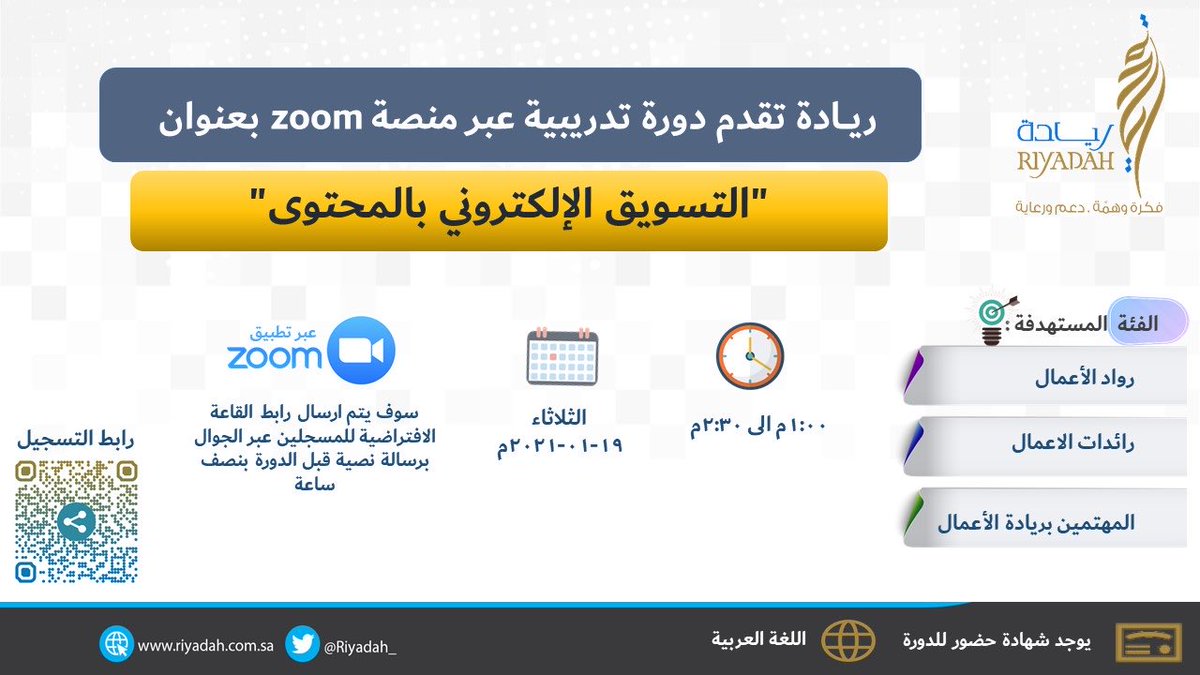 اعلان معهد ريادة إقامة دورة تدريبية (عن بُعد) للمهتمين بريادة الأعمال لحضور دورة تدريبية عبر منصة (Zoom)، بعنوان (التسويق الإلكتروني بالمحتوى) مع شهادة حضور للدورة، وذلك وفقاً لبقية التفاصيل الموضحة أدناه.