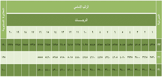 هو السلم المعتمد بالمرسوم الملكي رقم (4097 / ميجابايت) الصادر بتاريخ 6/25/1432 هـ والذي يتضمن الراتب الأساسي للموظفين على اختلاف درجاتهم الوظيفية ابتداء من الدرجة الأولى حتى الدرجة العشرين وكذلك رواتب الموظفين (31 ، 32 ، 33) وكذلك العلاوات السنوية المخصصة لهم ، وهنا هذا الجدول كالتالي: اضغط هنا