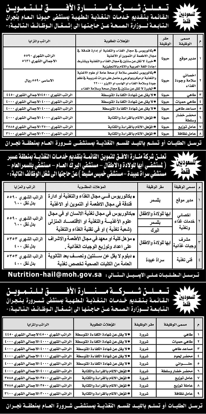 وظائف في شركة منارة الأفق للتموين، للعمل في مدينتي نجران وعسير وفق التفاصيل التالية: