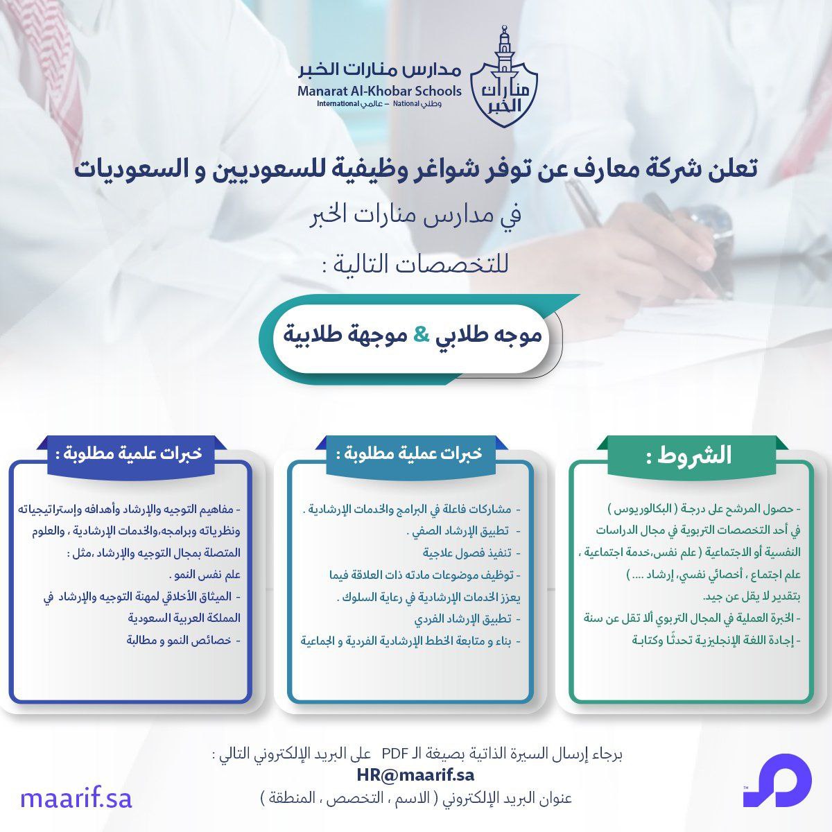 🔴 تعلن شركة #معارف_للتعليم وظائف للجنسين فى #الرياض و #جدة و #الخبر و #الدمام و #المدينة الوظيفة : موجه/ه طلابى – مدارس المنارات (الاهلية و العالمية) – مدارس نور الاسلام – مدارس الفيصلية الاسلامية