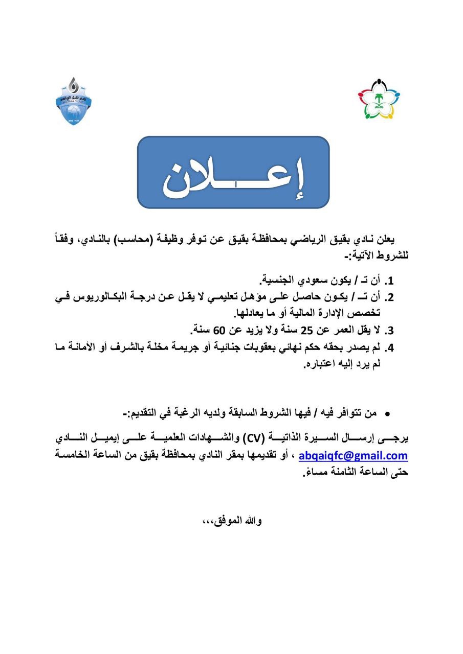 وظيفه للجنسين في نادى بقيق الرياضى بقيق