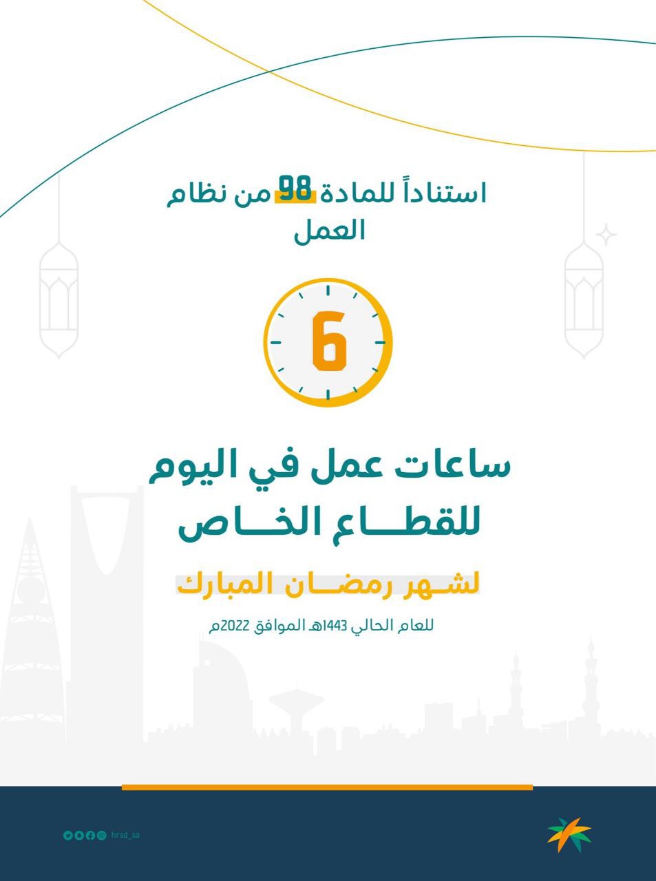 وزارة الموارد البشرية تعلن ساعات عمل القطاع الخاص خلال شهر رمضان المبارك ( ٦ ساعات ) فى اليوم