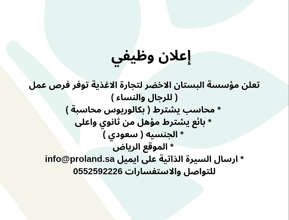 وظائف للجنسين في مؤسسة البستان الأخضر لتجارة الاغذية بالرياض