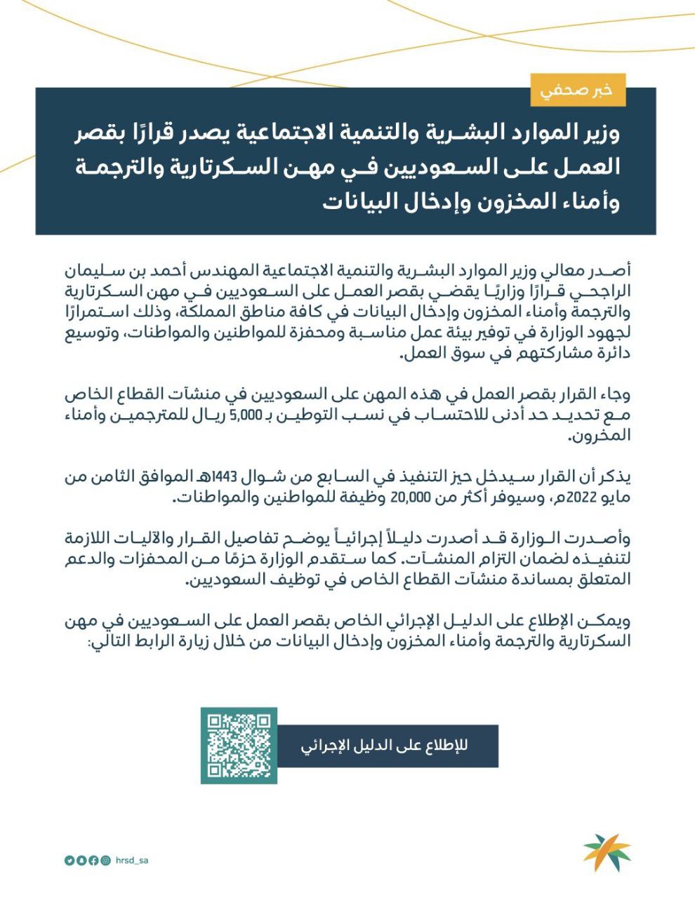 وزير الموارد البشرية يعلن بدء توطين ٢٠ الف وظيفة من اليوم