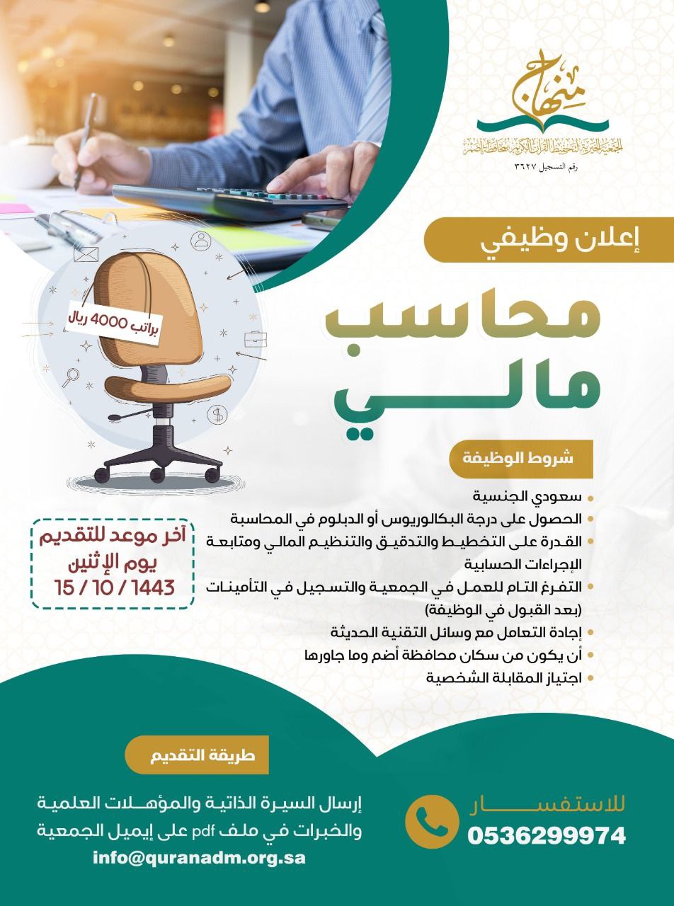 وظيفة بمجال المحاسبة في جمعية تحفيظ القرآن الكريم بأضم