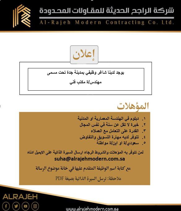 شركة الراجح الحديثة للمقاولات تعلن وظيفة هندسية للجنسين في جدة