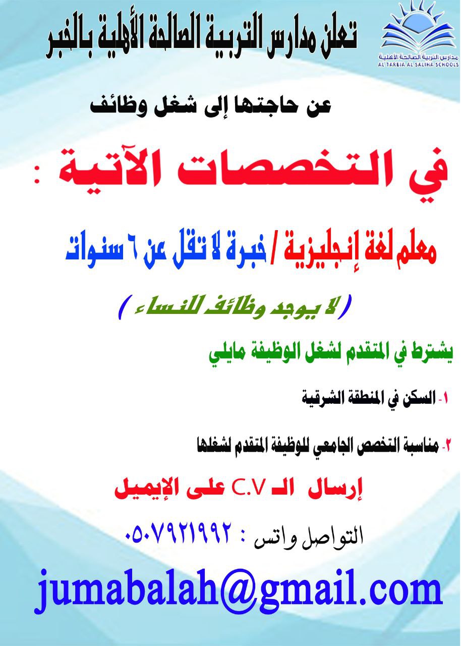 تعلن مدارس التربية الصالحة الأهلية، عن توفر عدد من الوظائف الشاغرة للعمل في (الخبر)