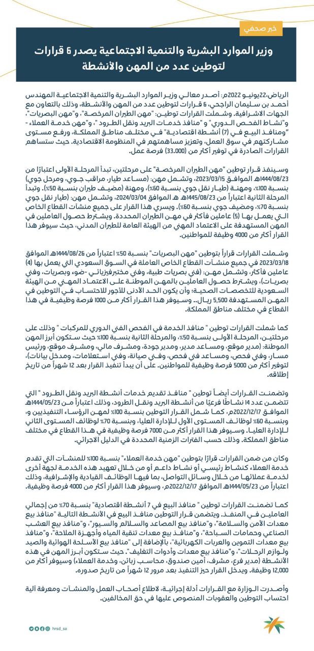 تعلن وزارة الموارد البشرية عن ٦ قرارات لتوطين عدد من المهن و الأنشطة