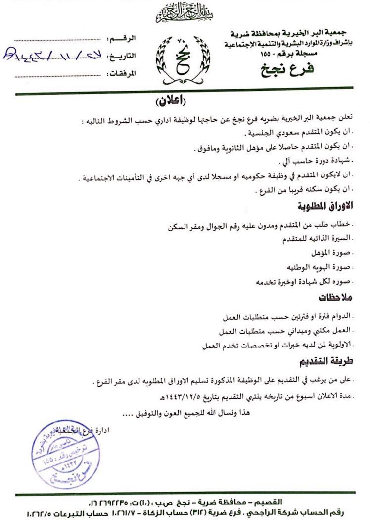 وظائف إدارية في جمعية البر الخيرية بمحافظة ضريه فرع نجخ بالقصيم