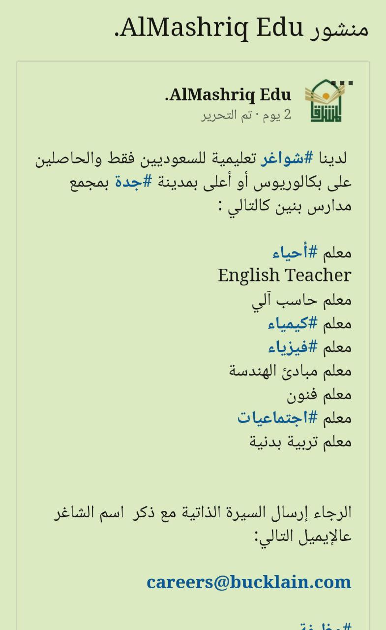 وظائف تعليمية في مدارس المشرق الأهلية بنين بجدة