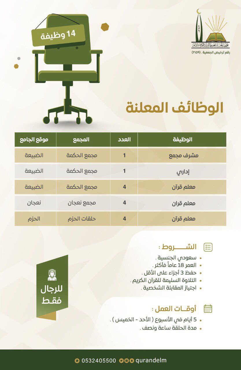١٤ وظيفة شاغرة في جمعية تحفيظ القران بالدلم بنظـاما لدوام الجزئي ” للرجال ”