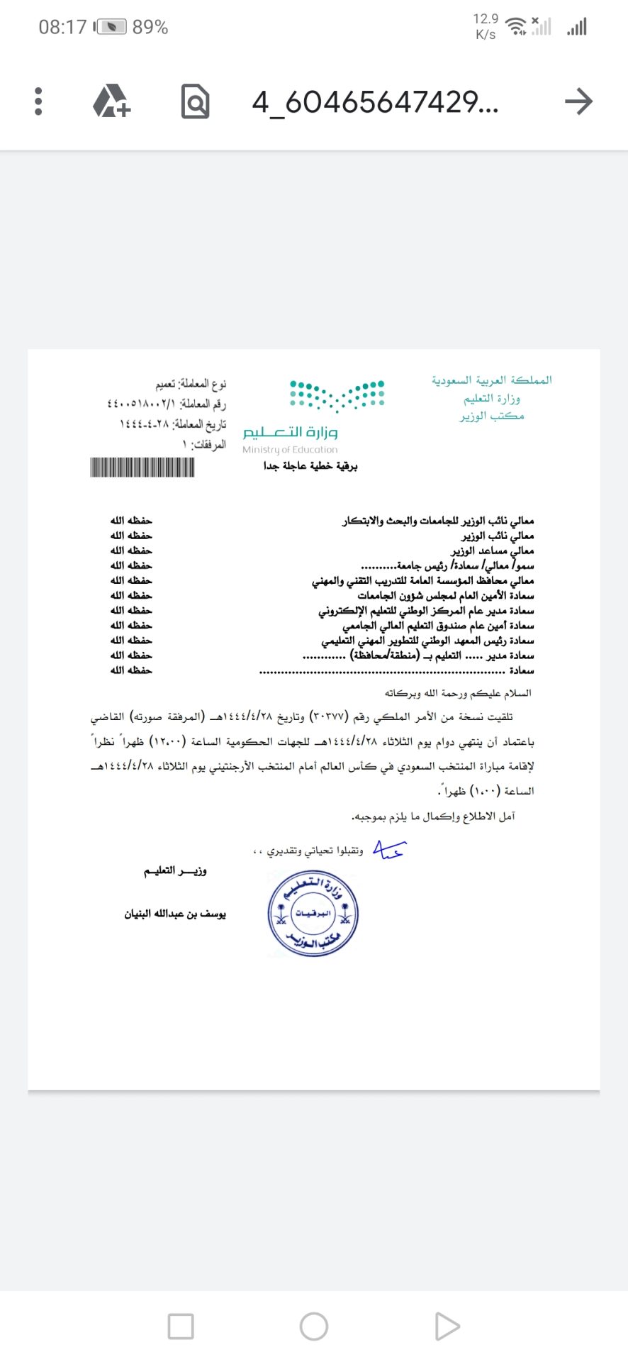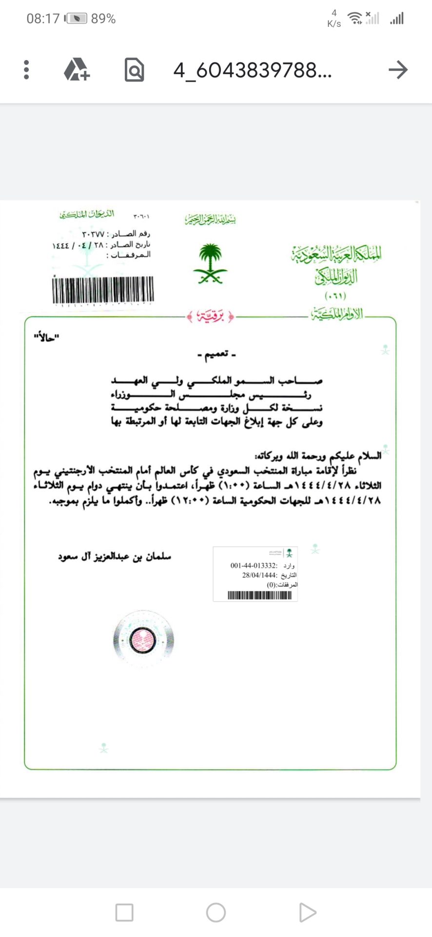 أمر ملكي باعتماد نهاية دوام اليوم الثلاثاء إلى الساعة 12 ظهراً نهاية دوام اليوم الثلاثاء إلى الساعة 12 ظهرًا لمتابعة مباراة المنتخب السعودي، صدرت توجيهات للوزارات والجهات الحكومية، باعتماد نهاية دوام اليوم الثلاثاء الساعة 12 ظهرًا؛ وذلك نظرًا لإقامة مباراة المنتخب السعودي أمام المنتخب الأرجنتيني في كأس العالم الساعة الواحدة ظهرًا.