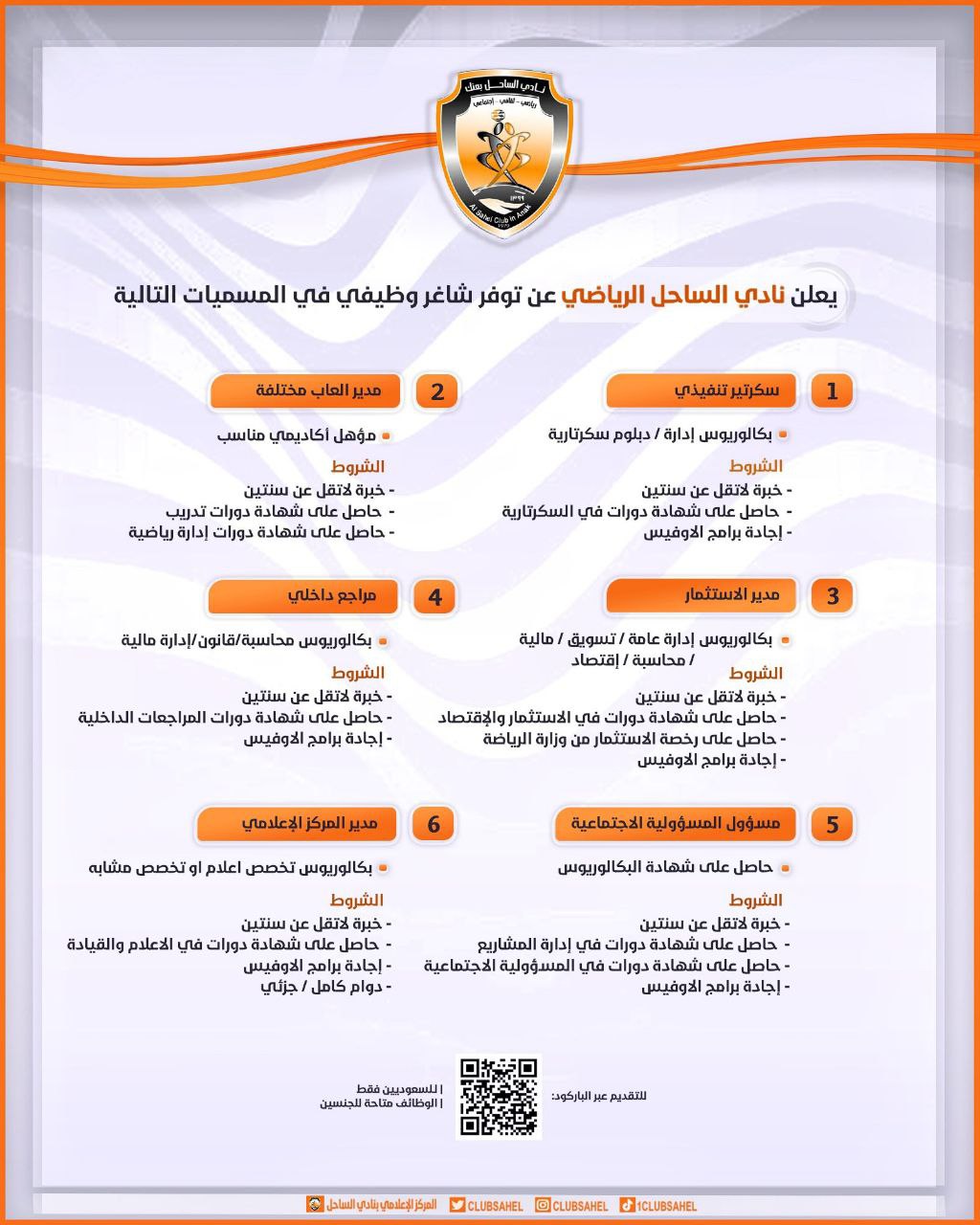 يعلن نادي الساحل الرياضي بمدينة عنك بالمنطقة الشرقية عن عدد من الوظائف الشاغرة وإليكم التفاصيل ..